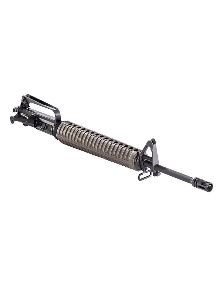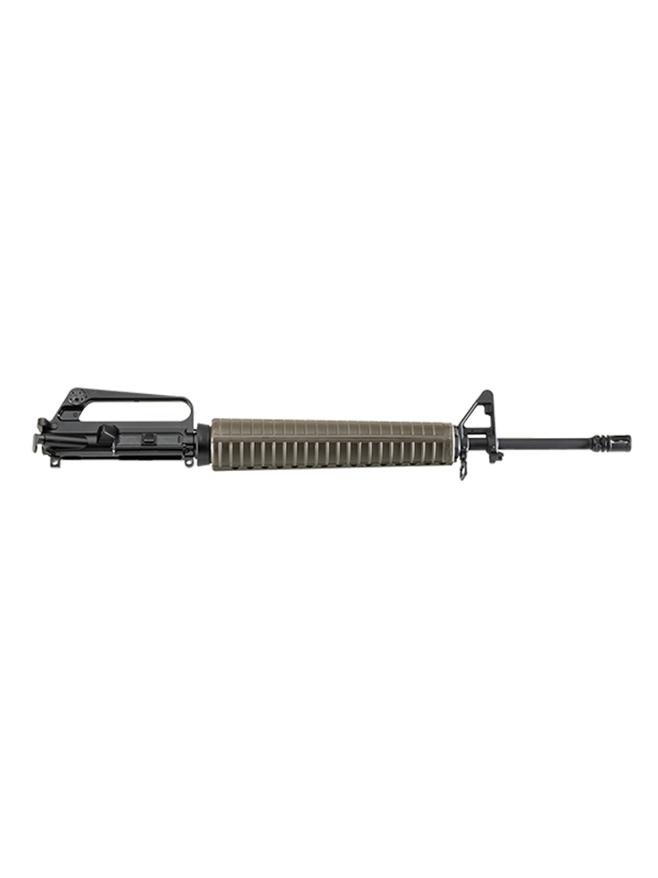 An A2 charging handle provides easy manipulation, while the A2 hand guard, available in either black or OD green, offers modern durability with a nod to the timeless design. For effective muzzle control, the upper is finished with an A2 flash hider, minimizing muzzle flash while enhancing shooting stability.